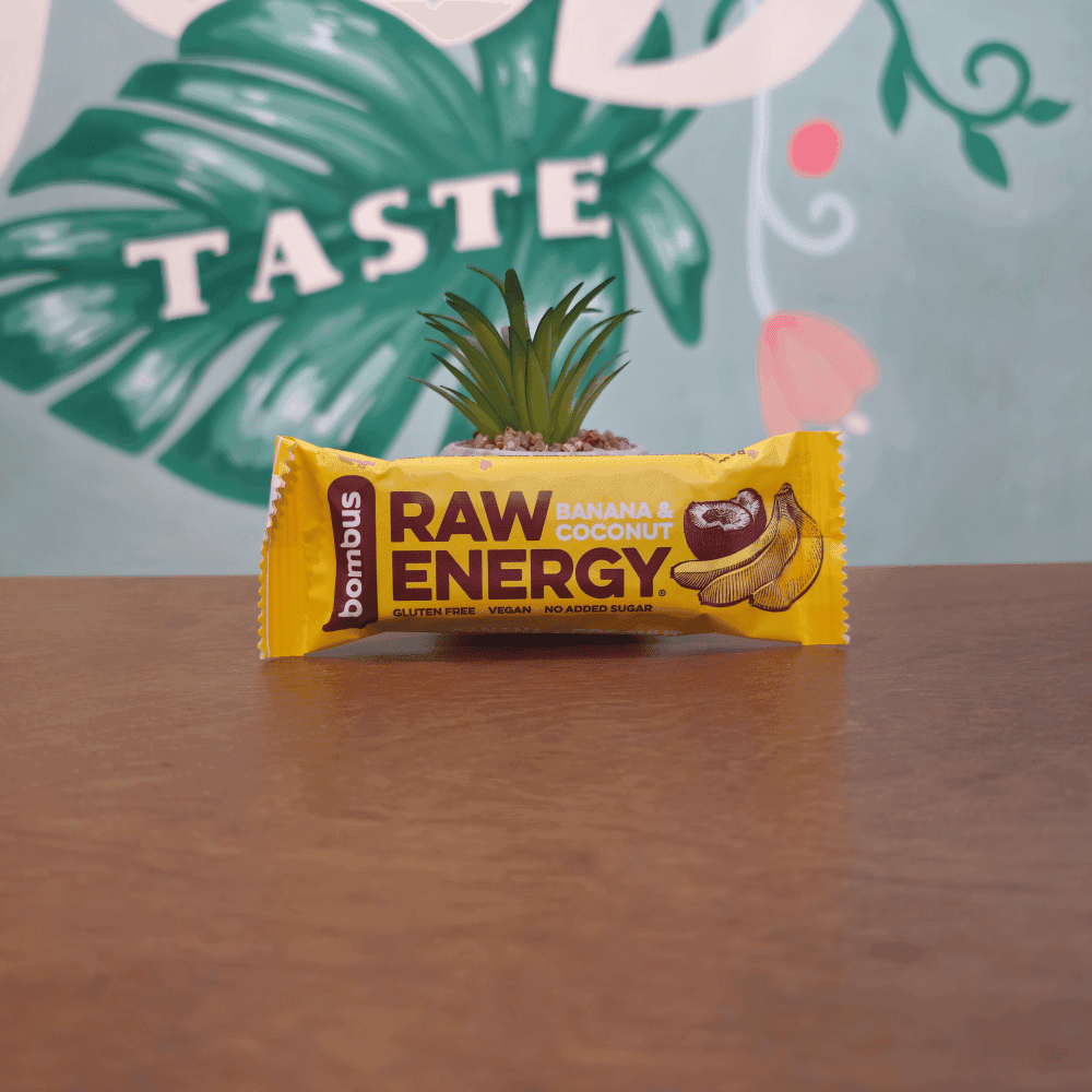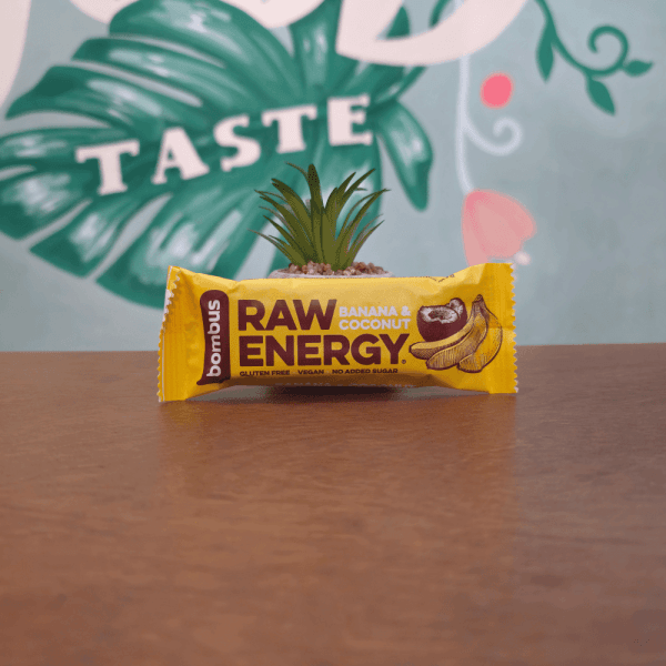 Bombus - Raw Energy bar with banana and coconut is a 100% natural fruit bar made from dried dates, banana and coconut - no added sugar, no gluten and no thermal processing. Rich in fiber and natural sugars from fruit, this bar is the perfect choice for a healthy snack, whether you're in the office, training or on the beach.