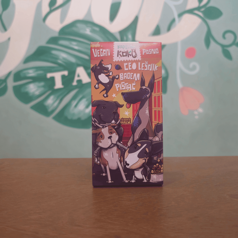 cocoa bean 9.6%, cocoa butter 10.2%, hazelnut paste 23.4%, date sugar 16.8%, whole stickleback, almond, pistachio 40%