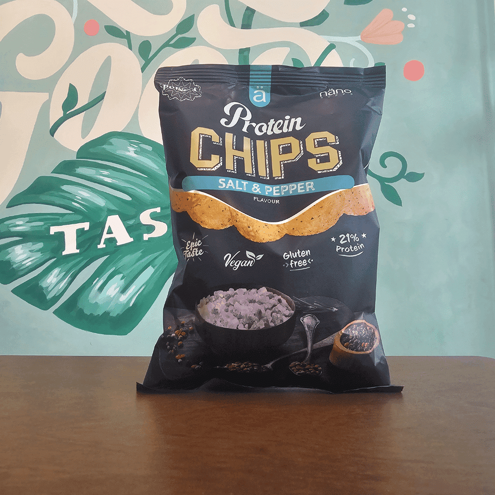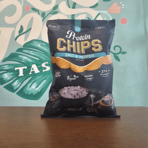 Protein chips with salt and pepper combine crunchiness and a healthy composition. High in protein and low in fat, it's a great choice for a guilt-free snack.
