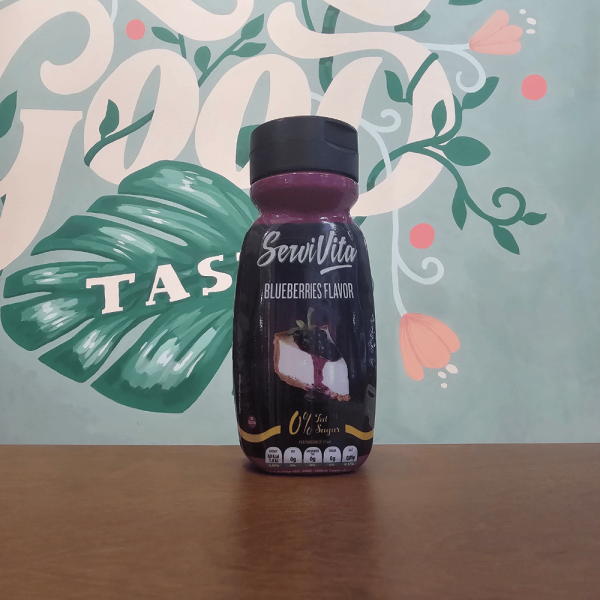 water, sweeteners (erythritol, maltitol, sucralose, steviol glycosides), stabilizer (xanthan gum), vegetable fibers (bamboo), colors (anthocyanins, carmine), acidity regulator (citric acid), preservative (potassium sorbate), salt, blueberry flavor.